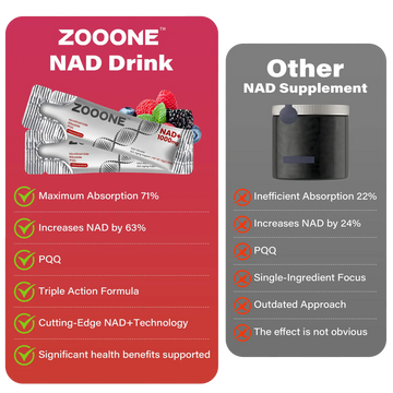Revitalize Your Body and Mind with Zooone™ NAD+ 1000mg – Formulated with Nicotinamide Riboside and PQQ, this powerhouse supplement is designed to naturally elevate your NAD+ levels, fueling your cells with energy and supporting healthy aging from the inside out. Experience a noticeable boost in energy, improved focus and mental clarity, and enhanced skin elasticity with each dose. Zooone™ also promotes mitochondrial function for sustained vitality, helping you stay sharp, energized, and youthful every day. Includes added Resveratrol for extra antioxidant support.